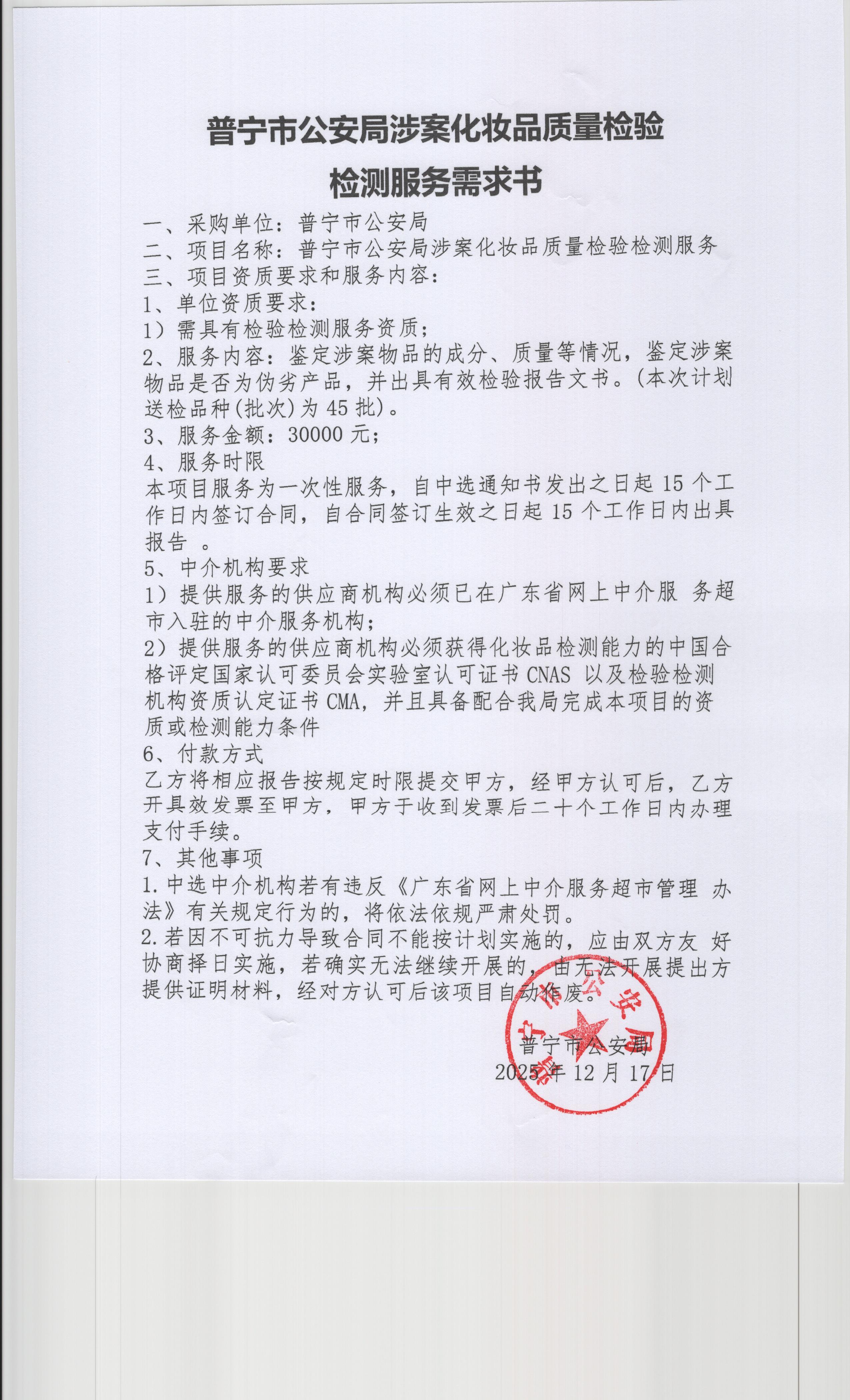 关于为【普宁市公安局涉案化妆品质量检验检测服务】公开选取【检验检测服务】机构的公告